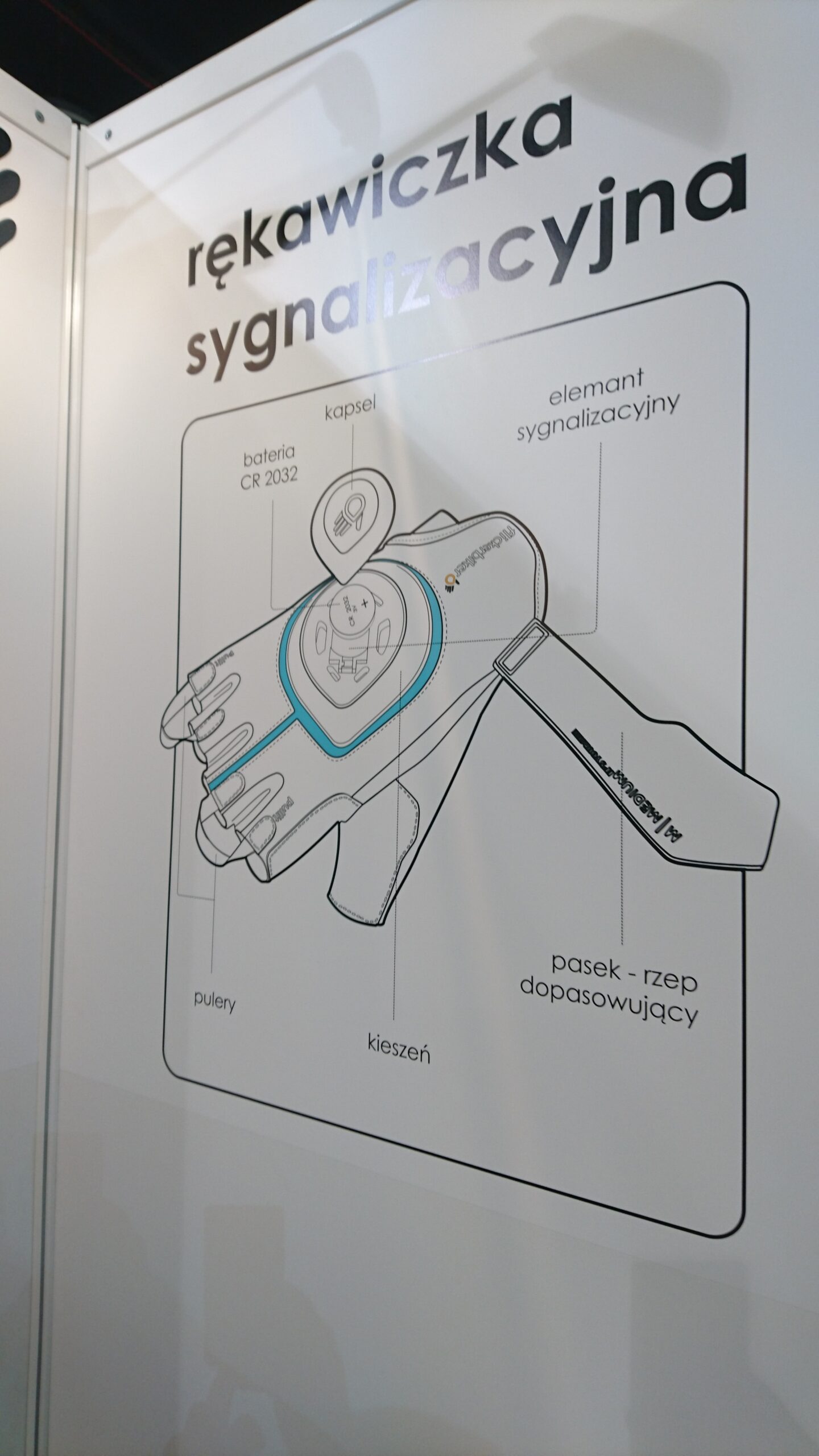 Na koniec ciekawostka. Rękawiczki z kierunkowskazem. Stoisko niepozorne, trochę przycupnięte niczym dziewczynka z zapałkami. Przeszliśmy obok stoiska, dostaliśmy ulotkę, która nas zawróciła. Rękawiczka z wszytą lampką czułą na ruch. Rękawiczka musi nauczyć się naszej ręki. Zapamiętuje, kiedy machamy odganiając muchę, a kiedy machamy wskazując innym kierunek jazdy. Komplet 160 zł.
